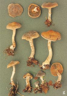 Cortinarius (Telamonia) hemitrichus (Pers.) Fr. (illustrated 40% life size) Cap 2–5cm across, conical, becoming flattened with an umbo; hygrophanous, cinnamon-brown under a dense layer of tiny white hair-scales. Stem 30–60×3–8mm, may be swollen at base; woolly white, with denser white zones. Flesh pallid when dry, brownish when wet, sometimes with a hint of violet; taste slight, smell strong, of pelargonium. Gills adnexed; pallid creamy grey at first then cinnamon. Spores 7–8×4–5¼, ellipsoid, finely roughened. Spore print rusty red. Habitat in mixed woodland, especially with birch; autumn. Frequent. Not edible.