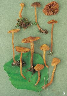 Cortinarius (Telamonia) helvelloides (Fr.) Fr. (illustrated 55% life size) Cap 1–3cm across, hemispherical then flat with a broad umbo; hygrophanous, reddish-brown when wet, ochre when dry; smooth, with silky white veil remnants on the margin. Stem 30–70×3–7mm, often twisted; dull brown, base sometimes darker, sometimes with a violet tint near the apex. Flesh ochre to brown; taste mild, smell slight. Gills distant; dull rusty brown. Spores 8.4–9×5.9–6.6¼, ovate, roughened. Spore print rusty brown. Habitat in alder swamps; early autunmn. Uncommon. Not edible.