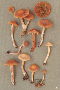 Cortinarius (Telamonia) flexipes var. inolens Lindstr. (illustrated 55% life size) Cap 1–3 (5) cm across, conical then expanded and umbonate; red-brown when moist, especially at the centre, drying pale fawn; covered in minute, white, fibrous scales when young, which disappear with age. Stem 30–80×3–6mm; brownish, with a distinct white, cottony ring. Flesh pallid brown; smell slight, of radish. Gills adnate; cinnamon. Spores 7–8.6×4.5–5.5¼, broadly elliptical. Spore print rust. Habitat in mixed woods; autumn. Common. Suspect avoid. Note this is rather a common small Cortinarius that is related to C. flexipes (above), but with an ochre-brown rather than grey appearance.