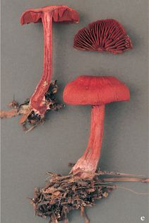 Blood-red Webcap Cortinarius (Dermocybe) sanguineus (Wulfen) Fr. syn. C. puniceus P.D. Orton (illustrated 60% life size) Cap 2–5cm across, flattened convex; carmine to dark blood-red, covered in radiating silky fibrils when viewed with a lens. Stem 30–60×3–8mm, slightly thickened at base; concolorous with cap or darker, base with pinkish or yellowish down; cortina red. Flesh concolorous, deep reddish-purple over gills and in stem cuticle; smell faint, pleasant. Gills adnate; concolorous with cap or darker, finally tinged rusty. Spores 7–9×4–6¼, elliptical, minutely roughened. Spore print rust. Habitat coniferous woods; autumn. Occasional. Suspect avoid.