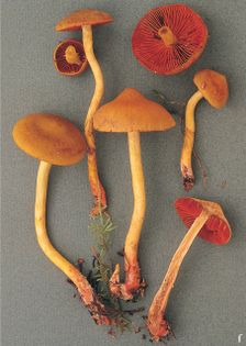 Surprise Webcap Cortinarius (Dermocybe) semisanguineus (Fr.) Gillet (illustrated 55% life size) Cap 2–6cm across, convex then expanded and umbonate; ochre- to olive-buff, often darker or tinged reddish at the centre; covered in fine fibres, disrupting into minute scales near the margin. Stem 20–100×4–12mm; ochraceous to olivaceous, paler at the apex, sparsely covered in olivaceous fibres below, base sometimes covered in pinkish to reddish down. Flesh ochraceous in stem, olivaceous in cap; taste slightly bitter, smell of radish. Gills adnate; blood-red. Spores 6–8×4–5¼, elliptical. Spore print rust. Habitat in mixed conifer and birch woods; autumn. Occasional. Suspect avoid.