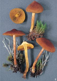 Cortinarius (Dermocybe) croceus (Schaeff.) Gray syn. C. cinnamomeobadius Rob. Henry (illustrated 55% life size) Cap 1–6cm across, convex then expanded and umbonate; rusty ochraceous-buff to chestnut, margin remaining yellowish for a long time. Stem 30–80×3–8mm; chrome-yellow, often tinged olivaceous above gills; taste mild, smell faint, radishy. Gills adnate; chrome to deep golden, then ochre-buff to rusty or amber. Spores 6.5–9×4.5–5¼, elliptical, almost smooth. Spore print rust. Habitat in coniferous and deciduous woods; autumn. Occasional. Suspect avoid.