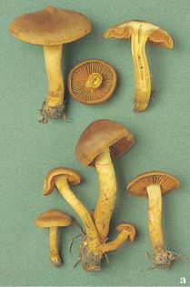 Cinnamon Webcap Cortinarius (Dermocybe) cinnamomeus (L.) Gray (illustrated 50% life size) Cap 1.5–6cm across, convex then expanded and often umbonate; olive-yellow to olive-buff, with reddish-brown tinge at centre, soon becoming bright red-brown to coppery; covered in radiating fibrils. Stem 25–100×3–10mm, lemon- to chrome-yellow, becoming ringed in tawny fibrous scales below from the veil; cortina yellowish. Flesh lemon- to chrome-yellow, tinged olivaceous above the gills; taste bitter and radishy, smell faintly of radish. Gills adnate; deep lemon- to chrome-yellow at first, then deep golden to tawny or bright golden-red. Spores 6.5–8×4–5¼, elliptical, almost smooth to minutely roughened. Spore print rust. Habitat with conifers and birch; autumn. Occasional. Suspect avoid.