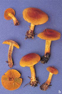 Cortinarius (Dermocybe) malicorius Fr. (illustrated 45% life size) Cap 2–6cm across, hemispherical then broadly convex; brownish-cinnamon, margin more yellow; fibrillose to minutely scaly. Stem 20–40×4–7mm, equal or slightly swollen at the base, soon hollow; bright yellow, often reddish near the base; cortina yellow. Flesh greenish-yellow; taste slight, smell slightly of radish. Gills adnexed; bright orange at first, then bright cinnamon-orange. Spores 5–7×3.5–4.5¼, ovoid, rough. Spore print rust-brown. Habitat in damp coniferous woods, normally in mountains; autumn. Uncommon, more frequent in Scotland. Not edible.