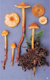 Phaecollybia christinae (Fr.) Heim (illustrated 45% life size) Cap 1–5cm across, sharply conical with a pointed umbo; bright foxy red; sticky when moist, shining. Stem 40–120×3–6mm, long, slender, deeply rooting; pale yellowish at the apex, darker below; cartilaginous, smooth. Flesh firm, brittle; concolorous with cap; taste rather tart, smell strong, plant-like. Gills slightly adnexed, crowded, narrow; light to dark rusty yellow. Spores 8.7–9.8×4.7–5.3¼, almond-shaped, roughened. Spore print rust-brown. Habitat in damp coniferous woods; autumn. Rare in Europe, not recorded for Brtiain. Not edible.