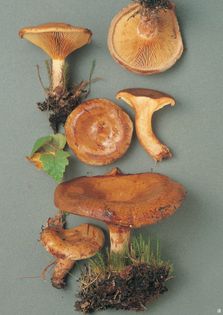 Brown Rollrim Paxillus involutus (Batsch) Fr. (illustrated 50% life size) Cap 5–14cm across, margin remaining inrolled; ochraceous or fulvous with olivaceous flush at first, becoming more rusty brown, finally hazel- or walnut-brown; viscid at centre when wet, downy throughout particularly at margin, becoming smooth later. Stem up to 75×8–12mm; concolorous with cap, becoming stained chestnut, especially with age or on bruising. Flesh pale ochre in cap, fulvous in stem base, darkening on cutting; taste acidic, smell fungusy. Gills decurrent, crowded; pale ochre then sienna, bruising vinaceous or chestnut. Spores 8–10×5–6¼, ellipsoid. Spore print sienna. Habitat in broad-leaved woodland, especially with birch on acid heathland; late summer to late autumn. Very common. Deadly poisonous it has been known to cause death after consumption over a period.