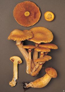Spectacular Rustgill Gymnopilus junonius (Fr.) P.D. Orton syn. Pholiota spectabilis var. junonia (Fr.) J.E. Lange (illustrated 40% life size) Cap 5–15cm across, convex then expanded; rich golden-tawny; covered in small, fibrous, adpressed scales. Stem 50–120×15–35mm, usually swollen in lower part but narrowed again at base; chrome-yellow to ochre-buff; fibrous; ring yellowish, becoming rusty from spores, membranous, soon collapsing. Flesh pale yellowish; taste bitter, smell not distinctive. Gills slightly decurrent; yellow then rusty brown. Spores 8–10×5–6¼, elliptical to almond-shaped, roughened. Spore print rust. Cheilocystidia skittle-shaped, thin-walled, hyaline. Habitat in dense clusters at the base of deciduous trees or on stumps or logs; late summer to early winter. Common. Not edible.