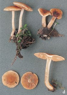 Hebeloma pusillum J.E. Lange (illustrated life size) Cap 1–2.5cm across, conico-convex then expanded, often with a small umbo; pallid tan, darkening to rufous or date-brown at centre; slightly viscid. Stem 20–40×2–3mm; white, discolouring brownish towards base; mealy. Flesh pallid; thin; taste bitter, smell of radish. Gills free; pallid at first, then clay-brown. Spores 10–14×5.5–7¼, almond-shaped, finely warted. Spore print clay-brown. Habitat with willow; summer to autumn. Occasional, more frequent in southern Britain. Unknown edibility.