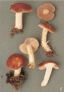 Hebeloma theobrominum Quadr. (illustrated 40% life size) Cap 4–6cm across, convex; dark tan to cocoa-brown; greasy. Stem 50–80×5–10mm; white. Flesh white; taste bitter, smell faintly of radish. Gills white at first, later milky coffee. Spores 7–11×4.5–5.5¼, almond-shaped, virtually smooth. Spore print brown. Cheilocystidia clavate with apex about 6¼ wide, thin-walled, hyaline. Habitat in grassy coniferous woods; autumn. Rare. Unknown edibility. Note in my first book I wrongly named this fungus H. truncatum.
