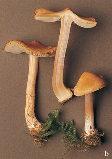 Straw Fibrecap Inocybe cookei Bres. (illustrated 55% life size) Cap 2–5cm across, conical or bell-shaped then flattened with a prominent umbo, margin cracking; ochre; covered in long fibres. Stem 30–60×4–8mm, bulb marginate; whitish with ochre flush. Flesh whitish then straw-yellow; taste mild, smell slight. Gills adnexed; whitish then pale cinnamon. Spores 7–8×4–5¼, bean-shaped, smooth. Spore print walnut-brown. Cheilocystidia pyriform, non-encrusted, thin-walled. Habitat in mixed woods; summer to late autumn. Occasional. Poisonous.