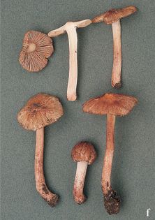 Inocybe adaequata (Britzelm.) Sacc. syn. I. jurana (Pat.) Sacc. (illustrated 40% life size) Cap 2–6cm across, conical to bell-shaped; buff with darker brown fibres radiating from the centre, soon becoming flushed reddish-brown or sometimes vinaceous-purple; the black patches on the caps shown here are mould. Stem 20–60×4–10mm, base slightly swollen; white, soon becoming reddish. Flesh white at first, becoming flushed pink in cap and stem base; taste mild or mealy, smell strongly mealy. Gills adnate or free; white at first then tinged clay. Spores 10–15×5–7¼, bean-shaped, smooth. Spore print walnut-brown. Cheilocystidia thin-walled, clavate, without apical encrustation. Habitat in deciduous or mixed woods, especially beechwoods on chalk; autumn. Uncommon. Not edible. Note I have adopted the earlier name for this.