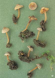 Scurfy Fibrecap Inocybe petiginosa (Fr.) Gillet (illustrated 60% life size) Cap 0.5–1.5cm across, convex to obtusely umbonate; initially covered in small, whitish scales, which are soon lost to leave a brown disc and white margin, the surface silky-fibrous. Stem 15–40×1–2mm; cream to reddish-brown; mealy. Flesh whitish in cap, reddish-brown in stem; thick at disc; taste mild, smell none. Gills adnexed; cream at first, later brown with an olivaceous tint, edge hairy under a lens. Spores 6.5–8.5×4–6¼, ovate, with several blunt knobs. Spore print walnut-brown. Cystidia thick-walled, fusoid; becoming yellow in ammonia. Habitat in deciduous woods, especially beech; autumn. Occasional. Unknown edibility.
