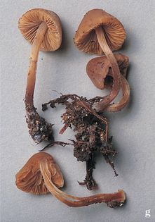 Conocybe moseri Watling (illustrated 90% life size) Cap 1–2cm across, bell-shaped; pale grey-brown; smooth. Stem 40–60×2–3mm; pallid, becoming darker towards the base; no ring. Flesh concolorous; thin; taste and smell not distinctive. Gills adnate; pale ochraceous-buff. Spores 9–16×5–9.5¼, broadly elliptical. Spore print ochraceous-brown. Cheilocystidia skittle-shaped, head 3.2–5¼ in diameter. Habitat in earth on roadsides, in gardens, or in fields; autumn. Very rare. Suspect. Note in my first book I used the incorrect American name C. plumbeitincta (Atk.) Singer. It is possible that this might be a member of the C. siennophylla complex, further study is required.