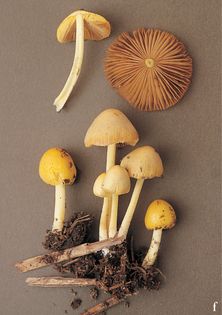 Yellow Fieldcap Bolbitius titubans (Bull.) Fr. syn. B. vitellinus (Pers.) Fr. (illustrated 50% life size) Cap 1–4cm across, acorn-shaped then bell-shaped, finally expanding to almost flat; chrome-yellow at first, fading to grey-brown at the margin; , very thin and almost transparent, somewhat viscid when young, drying shiny with age, deeply grooved at the margin. Stem 30–100×2–4mm; whitish-yellow, with a fine, mealy powdering, base downy; very delicate, hollow. Flesh thin and membranous above the gills. Gills crowded; pale yellow at first, later cinnamon or rusty. Spores 11–15×6–9¼, elliptical, smooth. Spore print rust-brown. Habitat on rotting straw, manured grassland, or wood chips; summer to late autumn. Very common. Not edible.