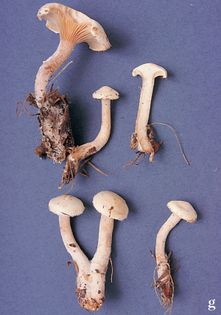 Bearded Seamine Ripartites tricholoma (Alb. & Schwein.) P. Karst. (illustrated 40% life size) Cap 2–5cm across, convex, becoming flat then sunken in the centre, with an incurved margin becoming radially lined with long, coarse hairs; white; tacky to dry, with appressed, silky hairs. Stem 25–50×3mm; whitish to dingy ochre-brown; faint bloom to suede-like, fragile, hollow. Flesh very soft; pallid; taste mild, smell slight, not mealy. Gills adnate, close, broad; white, becoming dull pinkish-cinnamon. Spores 4–5×3.5–4¼, ovate to subglobose, warted. Spore print pale brown. Habitat on humus or very decayed wood in forests. Uncommon on Red Data List; late summer to autumn. Unknown edibility.