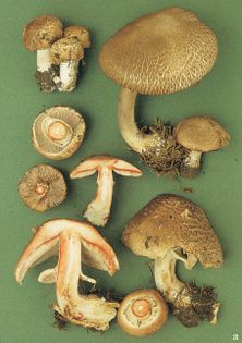 Blushing Wood Mushroom Agaricus silvaticus Schaeff. syn. A. haemorrhoidarius Schulzer (illustrated 40% life size) Cap 5–10cm across, convex; covered in ochre to brown fibrils, breaking up into small, adpressed scales. Stem 50–80×10–12mm; whitish, sometimes with brownish, fibrous scales below the dirty brown ring. Flesh white, reddening on cutting when fresh, later turning brownish; taste and smell not distinctive. Gills pale at first then reddish, later dark brown. Spores 4.5–6×3–3.5¼, ovate. Spore print brown. Cheilocystidia thin-walled, clavate. Habitat in mixed woods; summer to autumn. Common. Edible good.