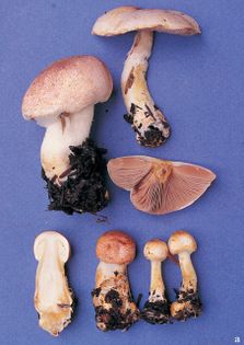 Lilac Mushroom Agaricus porphyrizon P.D. Orton (illustrated 45% life size) Cap 4–10cm across, convex; whitish with purplish-lilac, adpressed scales and fibrils, darker at centre, bruising dull yellow; smooth. Stem 50–100×12–20mm, clavate; white, staining yellow when touched; smooth; ring membranous, thin, simple. Flesh white, staining yellowish in stem, especially at base; taste and smell pleasant, of almonds. Gills free, crowded; white to pinkish, then brown. Spores 4.5–5.6×3.2–3.8¼, ovate. Spore print deep brown. Habitat in mixed woodlands, mostly with conifers; early autumn. Uncommon. Unknown edibility.