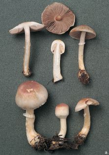 Agaricus dulcidulus Schulzer, Kalchbrenner (illustrated 50% life size) Cap 2–5cm across, obtusely ovate, expanding flattened-convex; white at first, soon covered in small, lilaceous scales at the centre, with vinaceous fibres radiating out towards the white margin, finally yellowing to a dirty brownish. Stem 30–60×4–8mm, with a bulbous base; white but yellowing at base; ring double, pendulous. Flesh white, staining yellow in stem base; taste and smell not distinctive. Gills free; very pale at first then pinkish, finally grey-brown. Spores 4.5–5×2.5–3¼, elliptical. Spore print brown. Cheilocystidia numerous, 12–26×4–14¼, ovate to broadly clavate, thin-walled, hyaline or brownish. Habitat in clearings and on the edges of deciduous and coniferous woods; summer to autumn. Rare. Poisonous to some people; best avoided. Note in my first book I published this mushroom as A. semotus, as did many mycologists; the correct name is now A. dulcidulus.