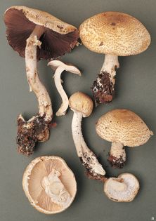 The Prince Agaricus augustus Fr. (illustrated 40% life size) Cap 10–20cm across, obtusely ovate at first, then expanding convex; yellowish-brown, covered in chestnut-brown, fibrous scales. Stem 100–200×20–40mm; whitish, bruising yellowish, with small scales below the ring which discolour brownish with age; ring white, large, and pendulous. Flesh white, becoming tinged reddish with age; thick; taste mushroomy, smell strongly of bitter almonds. Gills free; white at first then brown. Spores elliptical, 7–10×4.5–5.5¼. Spore print purple-brown. Cheilocystidia formed of chains of bladder-shaped elements. Habitat in coniferous and deciduous woods; late summer to autumn. Occasional. Edible good.