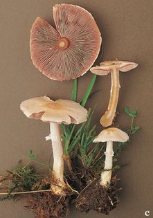 Agaricus comtulus Fr. (illustrated 55% life size) Cap 2–4cm across, convex expanding flat; white to ochraceous-cream. Stem 30–50×4–6mm; white or creamy, not bruising yellow; ring white and membranous. Flesh white, but yellowing slightly in the stem base; taste almondy, smell faintly of almonds or aniseed. Gills free; flesh-pink at first, darkening with age. Spores ovate, 4.5–5.5×3–3.5¼. Spore print brown. Habitat in pastureland; late summer to autumn. Occasional. Edible.