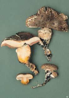 Agaricus lanipes (F.H. Møller & Jul. Schäff.) Singer (illustrated 50% life size) Cap 5–10cm across, convex at first, then depressed at the centre and undulate; chocolate-brown; breaking up into broad, flattened scales, especially towards the margin. Stem 40–60×20–35mm, squat, narrowing at the apex, swollen towards the slightly bulbous base, which tapers into a whitish, root-like, mycelial strand 1–10mm thick; white above the ring, brownish and slightly scaly below, bruising rust; ring white on upper surface, brownish below. Flesh white, becoming reddish on cutting, especially at the stem apex, and orange at the base; taste sweet and mushroomy, smell mushroomy. Gills free, crowded; pale pink at first, later dark brown. Spores 5.5–6.5×3.5–4¼, elliptical. Spore print dark brown. Cheilocystidia 16–28×8–14¼, tufted, clavate, thin-walled, hyaline. Habitat in deciduous woods and manured fields; summer to late autumn. Uncommon. Edible delicious.