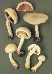 Yellow Stainer Agaricus xanthodermus Genev. (illustrated 35% life size) Cap 5–15cm across, subspherical with the top flattened, later becoming expanded convex; white at first, later often with tiny, indistinct, greyish-brown scales, bruising bright chrome-yellow, especially towards the margin. Stem 50–150×10–20mm, bulbous at the base; white; ring white, with a thickened edge, which can cause it to appear double. Flesh white, staining chrome-yellow in the stem base; taste slightly unpleasant, smell slightly of ink. Gills white at first, becoming pale pink, finally grey-brown. Spores 5–6.5×3–4¼, elliptical. Spore print purple-brown. Cheilocystidia 10–20×8–14¼, subglobose or ovate, thin-walled, hyaline. Habitat in woods, meadows, and gardens; summer to autumn. Occasional, vulnerable on Red Data List. Poisonous with symptoms of sweating, flushing, and severe stomach cramps, but only some people are affected.