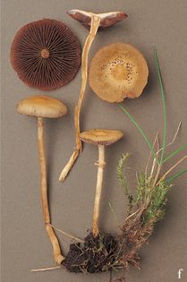Agrocybe paludosa (J.E. Lange) Kühner & Romagn. (illustrated 60% life size) Cap 1.5–3cm across, convex then flattened with broad umbo; dirty cream to pale tan, especially at centre. Stem 40–70×2–3mm; cream, flushed with cap colour; rather broad and fragile ring near apex. Flesh whitish in cap, brownish in stem; thin; smell of meal. Gills adnate; pale at first, then darker brown. Spores 9–10×5–5.5¼, ovate-elliptical. Spore print light cigar-brown. Cap cuticle cellular. Habitat in marshy meadows; late spring to summer. Uncommon. Not edible.