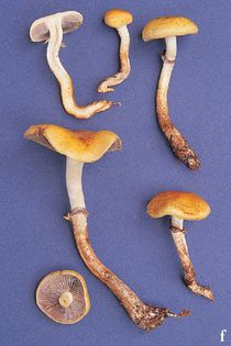 Stropharia squamosa (Pers.) Quél. (illustrated 50% life size) Cap 3–5cm across, convex-campanulate; dull yellow-ochre to tawny, with paler, faint scales at margin; viscid. Stem 60–120×3–10mm, long, rigid; brownish; scaly below the small ring. Flesh whitish; thin; taste and smell not distinctive. Gills adnate, crowded; pallid then purple-brown. Spores 12–14×6–7.5¼, elliptical, with pore at tip. Spore print purple-brown. Habitat on decayed wood chips in mixed woodlands and flower beds; late summer to autumn. Occasional. Not edible.