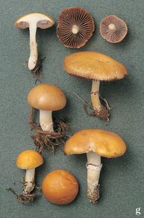 Garland Roundhead Stropharia coronilla (Bull.) Quél. (illustrated 55% life size) Cap 2–4cm across, convex then flattened; light yellow; slightly viscid or greasy. Stem 25–40×6–8mm, tapering towards base; white; ring white, but often accentuated by trapped deposit of dark spores. Flesh white; thick. Gills white then clay-brown. Spores 7–9×4–6¼, elliptical, with indistinct pore. Spore print purple-brown. Pleurocystidia broadly lanceolate with acutely pointed apex, staining deeply aniline blue in lactic acid. Habitat lawns and pasture; autumn. Occasional. Edible but not worthwhile.