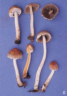 Psathyrella gossypina (Bull.) A. Pearson & Dennis (illustrated 55% life size) Cap 1–2.5cm across, hemispherical to bell-shaped, expanding slightly, margin hung with cottony white veil fragments; chestnut-brown, drying ochre; partly covered with veil remnants, striate. Stem 20–50×3–6mm, slightly enlarged towards the base; white, cream below; minutely cottony. Flesh yellow in the stem when young. Gills adnexed, crowded, narrow; pallid, becoming purple-grey. Spores 6–8×3.5–4¼, elliptical. Spore print black-brown. Cystidia lance-shaped. Habitat on the ground, often on fire sites; autumn. Uncommon. Not edible.
