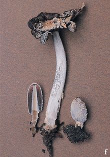 Coprinus narcoticus (Batsch) Fr. (illustrated life size) Cap 1–1.5cm high, cylindrical-ovate becoming flat, the margin becoming split and rolled back; pale grey, covered in coarse, white, granular meal, becoming buff and warty towards the centre. Stem 15–65×2–8mm, sometimes rooting at the base. Flesh smell strongly of tar-gas. Gills free; white, rapidly becoming black and deliquescing. Spores 11–13.5×5.5–7¼, elliptical to almond-shaped, remains of perispore often visible. Spore print black. Mealy covering of cap formed of globose, thin-walled cells, ornamented with granular warts. Habitat on dung or manured soil; autumn. Rare. Unknown edibility.