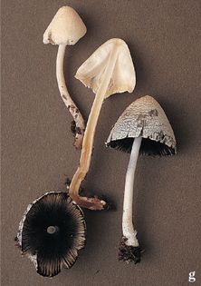 Coprinus pachyspermus P.D. Orton (illustrated life size) Cap 1–3cm high, elliptical, sometimes with pointed apex, expanding to broadly conical and splitting at the margin; grey or creamy; covered in coarse, mealy, flocculose scales. Stem 30–110×2–4mm; white; fragile, sometimes with the remains of the mealy veil around the base. Flesh smell none. Gills free; cream then black and deliquescing. Spores 15–17×12.5–14¼, elliptical to ovate. Spore print black. Basidia 2-spored. Mealy covering of cap formed of globose, smooth, thin-walled cells. Habitat on cow dung; summer. Very rare. Unknown edibility.