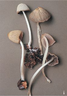 Coprinus impatiens (Fr.) Quél. (illustrated 55% life size) Cap 1–3cm high, elliptical then broadly convex, finally flat; pale buff with cinnamon centre, drying whitish, strongly grooved to centre. Stem 70–100×2–4mm; white. Flesh smell none. Gills free; pale clay-buff then greying, hardly deliquescing. Spores 9–12×5–6¼, elliptical. Spore print dark umber. Dermatocystidia 70–120×8–14m, lageniform with rather acute apex, thin-walled. Habitat in leaf litter or soil in deciduous woods, especially beech on chalk; autumn to winter. Occasional. Unknown edibility.