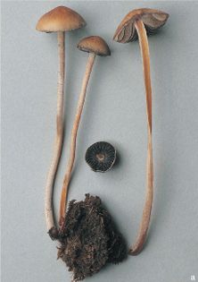 Panaeolus subfirmus P. Karst. syn. P. speciosus P.D. Orton (illustrated 40% life size) Cap 2–7cm across, conical to convex; buff or dull brown at first, becoming more greyish, with darker olivaceous-brown zone near the margin, tinged ochraceous or tawny at the centre, drying greyish or buff; cracking. Stem 70–175×2–5mm; whitish, tinged tawny or greyish-pink, base dusted white; hollow. Flesh concolorous with cap; smell faint, mushroomy. Gills adnate; clay-buff, becoming mottled blackish. Spores 14–20×8–10×10–12¼, angular lemon-shaped. Spore print blackish. Habitat on horse or sheep dung; late summer to autumn. Uncommon. Unknown edibility.