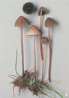 Panaeolus acuminatus (Schaeff.) Gillet syn P. rickenii Hora (illustrated 60% life size) Cap 1–2cm across, convex to conical with prominent umbo; dark brown and striate at margin when moist, drying pale buff or tan, flushed tan towards the centre. Stem 50–100×2–3m; pinkish-brown or tan with paler apex. Flesh tan; thin; taste not distinctive, smell mushroomy. Gills adnate; grey, soon becoming black. Spores 13–16×9.5–11¼, lemon-shaped. Spore print black. Habitat in damp pastureland; summer to autumn. Common. Not edible. Note in my last book this was included as P. rickenii; some mycologists consider it a form of P. acuminatus.