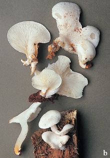 Ossicaulis lignatilis (Pers.) Redhead & Ginns syn. Pleurotus lignatilis (Pers.) P. Kumm. (illustrated 60% life size) Cap 1.5–5cm across, slightly depressed; creamy white. Stem 5–20×4–8mm, central or slightly excentric; whitish, discolouring ochraceous. Flesh white; smell strong, of meal. Gills crowded; white then ochraceous-cream. Spores 4.5×2.5¼, oval. Spore print white. Habitat on dead deciduous wood, especially inside the hollow trunks of beech and elm, where it produces a brown rot; autumn. Occasional. Unknown edibility. Note this fungus was included in Pleurotus in my first book.