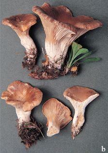 Pleurotus eryngii (D.C.) Quél, (illustrated 40% life size) Cap 3–10cm across, convex then centrally depressed, margin remaining down-turned; dirty whitish at first, then brownish; slightly velvety at first, remaining so at margin but elsewhere soon smooth. Stem 30–100×10–30mm, usually slightly excentric; whitish. Flesh white; taste and smell pleasant. Gills decurrent; greyish. Spores 10–14×4–5¼, narrowly elliptical. Spore print white. Habitat on roots and decaying remains of umbellifers, especially Eryngium campestre; spring to autumn. Not yet found in Britain; my collection was made in France. Edible.