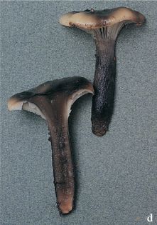Gomphidius maculatus Fr. syn. G. gracilis Berk. & Broome (illustrated 55% life size) Cap 3–6cm across, flat then funnel-shaped; whitish or greyish, blotched with black in older specimens; glutinous. Stem 45–75×10–20mm; whitish, becoming streaked sepia, base yellowish; dry at apex. Flesh white in cap, reddening throughout with a vinaceous tint in stem base, blackening with age in places; taste and smell not distinctive. Gills distant, decurrent; whitish, becoming vinaceous-grey, darkening with age. Spores 17–23×6–8¼, subfusiform. Spore print fuscous black. Habitat with larch; late summer to autumn. Rarely reported but apparently widespread. Edible but not recommended.