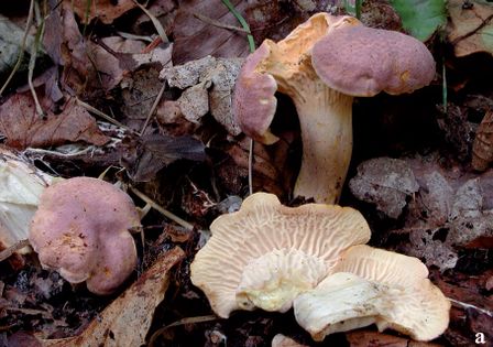 Amethyst Chanterelle Cantharellus amethysteus (Quél.) Sacc. syn. C. cibarius var. amethysteus. Quél. (illustrated 55% life size) Cap 3–6cm across, convex, soon flattened and depressed at centre, margin irregular, wavy, inrolled; dull orange; dry, felty, with fine, purplish-lilac, woolly or felty scales, especially at centre but sometimes overall. Stem 2–4×1–2cm, tapering below; pale yellowish-orange, bruising deep tawny; fleshy. Flesh pale cream-yellow, brownish-orange when cut; firm; smell and taste pleasant, faintly of apricots. Spore-bearing surface wrinkled, thin, resembling narrow, forking gills, running down stem; pale yellow-orange to pinkish-orange, bruising darker. Spores 8–10×4.5–6¼, broadly elliptical, smooth. Spore print white. Habitat in grass or leaf litter under broad-leaved trees, especially oak, beech, and birch, rarely under pine; late summer to autumn. Uncommon. Edible. Note photographed by Geoffrey Kibby.