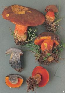 Boletus luridiformis Rostk. syn. B. erythropus sensu auct. mult. (illustrated 45% life size) Cap 8–20cm across; bay to walnut-brown with olivaceous tints, tending to yellowish-ochre towards the margin, bruising blue-black; slightly velvety at first, soon becoming smooth, sometimes slightly viscid when wet. Stem 45–145×20–50mm; yellowish, densely covered in red dots; robust. Flesh yellow, immediately dark blue on cutting; taste and smell not distinctive. Tubes lemon-yellow then greenish, turning dark blue on cutting. Pores small, round; orange-red, becoming rusty with age, readily bruising dark blue to black. Spores 12–15×4–6¼, subfusiform. Spore print olivaceous walnut-brown. Habitat in coniferous, broad-leaved, and mixed woodland; late summer to autumn. Frequent. Edible only when cooked, can cause gastric upsets. Note this dramatically coloured fungus was previously named B. erythropus and commonly reported.