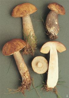 Leccinum rigidipes P.D. Orton (illustrated 30% life size) Cap 7–12cm across; buff to ochraceous with darker disc; slightly downy or smooth with irregular small scales. Stem 60–100×20–35mm; apex covered in brown scales, gradually becoming darker below. Flesh white, flushing coral in cap; firm; taste and smell not distinctive. Tubes white, becoming buff. Pores small; colouring similar to tubes, bruising dark ochraceous. Spores 18–19×6–6.5¼, subfusiform. Spore print ochraceous walnut-brown. Habitat on wet heaths in association with birch; summer to autumn. Rare. Edible but not worthwhile. Note in my first book this was named L. oxydabile, a misapplied name.