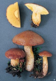 Suillus collinitus (Fr.) Kuntze syn. S. fluryi Huijsman (illustrated 50% life size) Cap 3–10cm across; reddish-buff, overlaid with network of purplish-brown streaks. Stem 15–30×25–100mm, with pointed base; yellowish, covered in purplish-brown flecks. Flesh light yellow, flushed vinaceous immediately below cuticle and in stem base; taste indistinct, smell fungusy. Tubes lemon-yellow, unchanging. Pores small, irregular; initially pale yellow then yellowish-cinnamon. Spores 7.8–11×3.3–4.3¼, subcylindrical. Spore print ochraceous. Habitat in coniferous woodland; autumn. Rare, vulnerable on Red Data List. Unknown edibility.