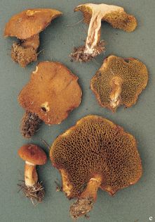 Hollow Bolete Suillus cavipes (Opat.) A.H. Sm. & Thiers syn. Boletinus cavipes (Opat.) Kalchbr. (illustrated 50% life size) Cap 3–8cm across, convex or slightly umbonate at first, then expanding, often becoming irregular or lobed at the margin; entirely golden-yellow or more often rusty-tawny to umber; suede-like or even felty-scaly. Stem 40–80×10–20mm; lemon-yellow with an indistinct net above the white, cottony ring, darker and covered in brownish fibrils below. Flesh whitish, tinged yellow in cap, sometimes pinkish in stem; taste and smell pleasant. Tubes short; yellowish then flushed olivaceous. Pores large, angular; concolorous with tubes. Spores 7–10×3–4¼, subcylindrical to fusiform. Spore print olivaceous. Habitat with larch; late summer. Very rare, endangered on Red Data List. Edible but poor.