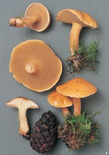 Bovine Bolete Suillus bovinus (L.) Roussel (illustrated (e) 60% life size) Cap 3–10cm across; clay-pink with cinnamon or ochraceous flush, distinct white margin; viscid with pale, sticky covering. Stem 40–60×5–8mm; sienna-yellow, arising from pink mycelium. Flesh whitish or yellowed, gradually becoming clay-pink, particularly in cap or stem base, rusty-coloured in stem; taste sweet, pleasant, smell fruity. Tubes grey-vinaceous. Pores large, angular, compound; olivaceous-buff at first then ochre, finally clay-buff with ochraceous flush. Spores 8–10×3–4¼, elliptical-subfusiform. Spore print olivaceous walnut-brown. Habitat in coniferous woods, especially with Scots pine; late autumn. Common. Edible.