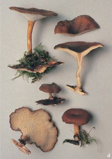 Winter Polypore Polyporus brumalis (Pers.) Fr. (illustrated 40% life size) Cap 1–12cm across, convex, centrally depressed, margin often wavy and rolled under; grey-brown, rusty, or tobacco-brown; glabrous or minutely bristly, especially at the margin. Stem 20–40×2–7mm, usually central, often curved and thickened at base; yellow-brown or tawny. Flesh white; leathery. Tubes 0.5–2mm long, slightly decurrent; whitish at first, later pallid or tan. Pores 4–6 per mm, circular; white to cream. Spores 5–6×1.5–2.5¼, subcylindrical; white. Hyphal structure dimitic, with generative and binding hyphae; generative hyphae with clamp connections. Habitat on dead wood of deciduous trees, usually logs and fallen branches; winter through to at least early spring. Common. Not edible. Note P. ciliatus Fr. is very similar but fruits in summer; in my first book I published this picture as P. ciliatus.