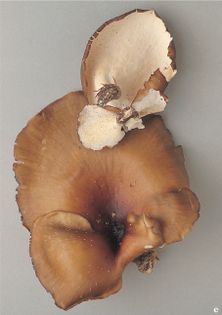 Bay Polypore Polyporus durus (Timmerm.) Kreisel syn. P. badius (Pers.) Schwein. (illustrated 40% life size) Cap 5–20cm across, funnel-shaped, often lopsided and lobed; pallid grey-brown at first then chestnut, darker at centre; very thin, viscid when fresh, drying smooth and shiny. Stem 20–35×5–15mm, usually eccentric; black at least at base; taste bitter. Tubes 0.5–2.5mm long, decurrent; white, later cream. Pores 4–7 per mm, circular; white to cream. Spores 5–9×3–4¼, elongate-elliptical; white. Hyphal structure dimitic, with generative and binding hyphae; generative hyphae without clamps. Habitat on dead or living deciduous trees; spring to autumn. Frequent. Not edible.