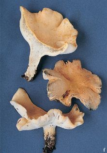 Albatrellus ovinus (Schaeff.) Murrill (illustrated 45% life size) Cap 5–15cm across, usually single but sometimes several fused together, circular to more irregular when fused, convex at first, then becoming depressed, dish-shaped; white to pale buff or tan; dry, smooth, or a little scaly with age. Stem 20–75×10–30mm, slightly swollen, pointed at the base, usually central; white, bruising pinkish; smooth. Flesh 5–20mm thick; white, drying yellowish; firm; taste mild, sometimes slightly bitter, smell pleasant, fungusy, aromatic. Tubes 1–2mm deep, decurrent; white. Pores 2–4 per mm, angular; white to yellowish. Spores 3–4.5×3–3.5¼, subglobose-elliptical. Spore print white. Hyphal structure monomitic. Habitat on the ground with conifers, especially silver fir, pine, and spruce; winter to summer, annual. Very rare in Britain, better known from Europe. Edible. Note A. confluens (Fr.) Kotlaba & Pouz. is similar but darker, orange-hued, and bitter.