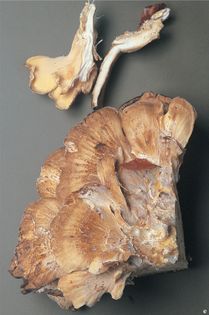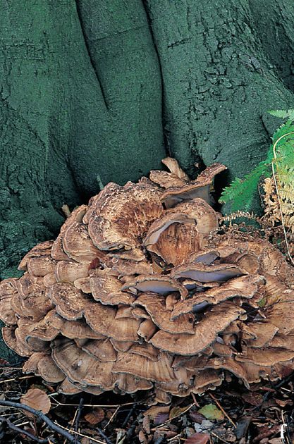 Giant Polypore Meripilus giganteus (Pers.) P. Karst. syn. Polyporus giganteus (Pers.) Fr. syn. Grifola gigantea (Pers.) Pilát (illustrated (e) 25% life size) Fruit body 50–80cm across, rosette-like, short stems from the common base ending in numerous flattened, fan-shaped caps, each 10–30cm across, 1–2cm thick; the upper surface concentrically zoned light and darker brown, covered in very fine, brown scales; radially grooved. Flesh white; soft, fibrous; taste slightly sour, smell pleasant. Tubes 4–6mm long, whitish. Pores 3–4 per mm, subcircular, often late in forming; whitish, bruising blackish. Spores 5.5–6.5×4.5–5¼, broadly ovate to subglobose, hyaline. Hyphal structure monomitic; generative hyphae without clamps. Habitat at the base of deciduous trees or stumps or arising from the roots some distance from them, usually on beech but sometimes also on oak; autumn. Common. Edible but can be a little bitter.