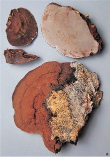 Southern Bracket Ganoderma australe (Fr.) Pat. syn. G. adspersum (Schulz.) Donk (illustrated 25% life size) Bracket 7–60×5–25cm across, 3–30cm thick, margin thick and obtuse; white in the growing season; upper surface with a thick, hard, knobbly, dark brown crust, concentrically ridged. Flesh dark brown; thicker than the tube-layer. Tubes stratified, reddish-brown. Pores 3–4 per mm, circular; white to pale yellow-ochre, discolouring when handled. Spores 8–13×5.5–9¼, mostly about 10×6.5¼, ovate, truncate at one end; brown. Cocoa-like spore deposit is often very dense on the top of cap and the wood above it. Hyphal structure trimitic; generative hyphae with clamp connections, but these are often difficult to demonstrate. Habitat parasitic on deciduous trees, usually on the lower part of the trunks; all year, perennial. Very common. Not edible.