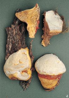 Fomitopsis pinicola (Sw.) P. Karst. syn. Polyporus pinicola (Sw.) Fr. (illustrated 35% life size) Fruit body 10–30×15–60cm across, 5–20cm thick, hoof-shaped; pallid, becoming straw-yellow and later reddish-brown; exuding clear droplets when fresh, glossy as if varnished, older parts covered in a hard, resinous skin. Flesh white to straw-yellow; corky to woody. Tubes 2–8mm long in each layer, cream to straw-yellow. Pores 3–4 per mm, circular; whitish, bruising or ageing cream to straw-yellow or apricot. Spores 6–18×3.5–4¼, cylindrical-elliptical. Habitat on conifers, less frequently on deciduous trees; perennial. Very rare in Britain, common in Europe. Not edible.